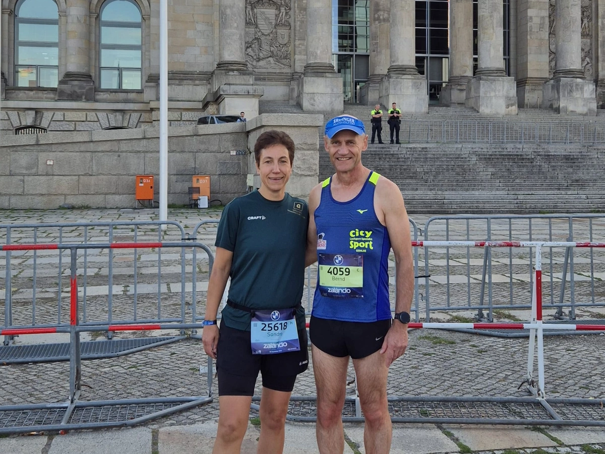Nach etlichen Trainingskilometern, Wettkampfstrecken und langen Vorbereitungsläufen ging es schließlich nach Berlin. Im Vorfeld hatte mich Bernd zum Fototermin um 08:15 Uhr am Reichstag eingeladen. Eine Stunde später startete er auf die Laufstrecke, und um 10:10 Uhr durfte ich, mit Blick auf die Siegessäule, ebenfalls loslaufen. Das Wetter meinte es gut mit uns – die Temperaturen von über 20 Grad waren allerdings eine echte Herausforderung. Kilometer 10 bis 30 wurden zum Kampf zwischen Körper und Geist.