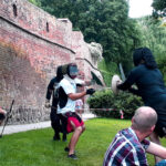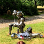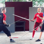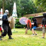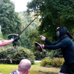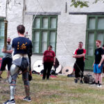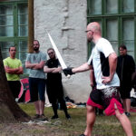 Wer Kampfsport oder HEMA betreibt, war herzlich zum Mittrainieren eingeladen. Diesem Ruf folgten eine Reihe von Fechtern – vielen Dank an dieser Stelle an alle Mittstreiter! Zusammen haben wir einen Tag lang gesportet, gespielt und geschwitzt. Auf dem Programm standen neben Einzelkämpfen mit Buckler oder Rundschild, Rapier oder langem Schwert und Schnitttests mit dem scharfen Schwert auch der Kampf in Rüstung und der Linienkampf.