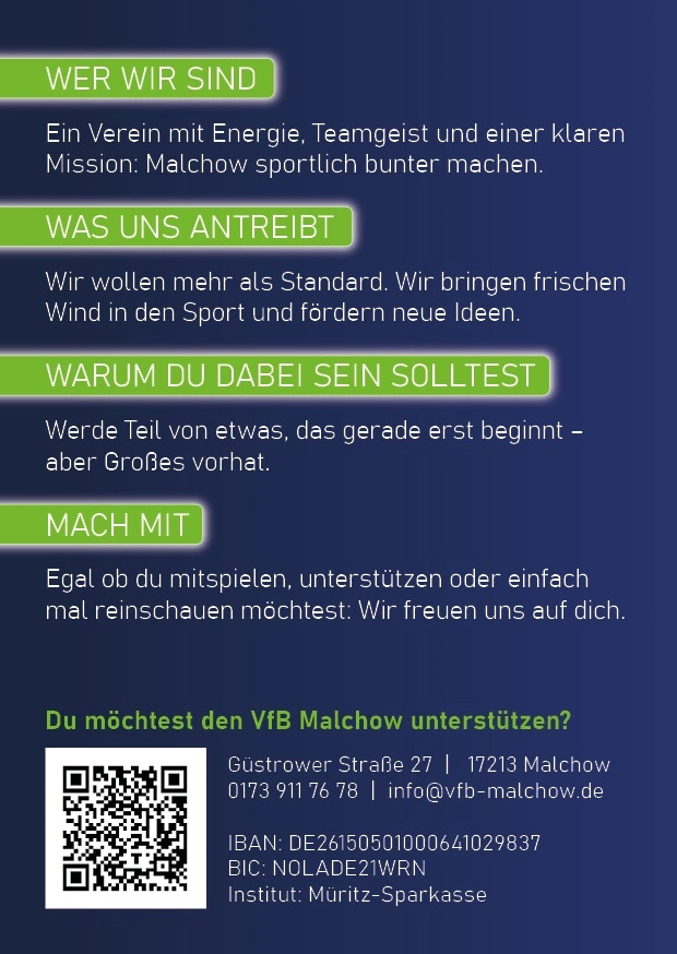 Der Verein möchte mehr als Standard bieten – er möchte Raum schaffen für neue Ideen, moderne Vereinsarbeit und ein Miteinander, das alle einschließt. Egal ob auf dem Feld, hinter den Kulissen oder als Förderer: Beim VfB Malchow findet jede und jeder einen Platz.