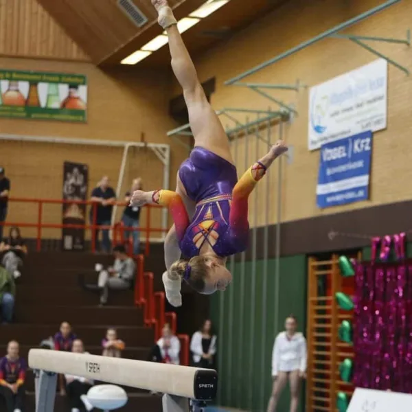 Leni: Barren. Was ich am besten turne, ist schwer zu sagen aber am liebsten den Doppelsalto in der Akro.