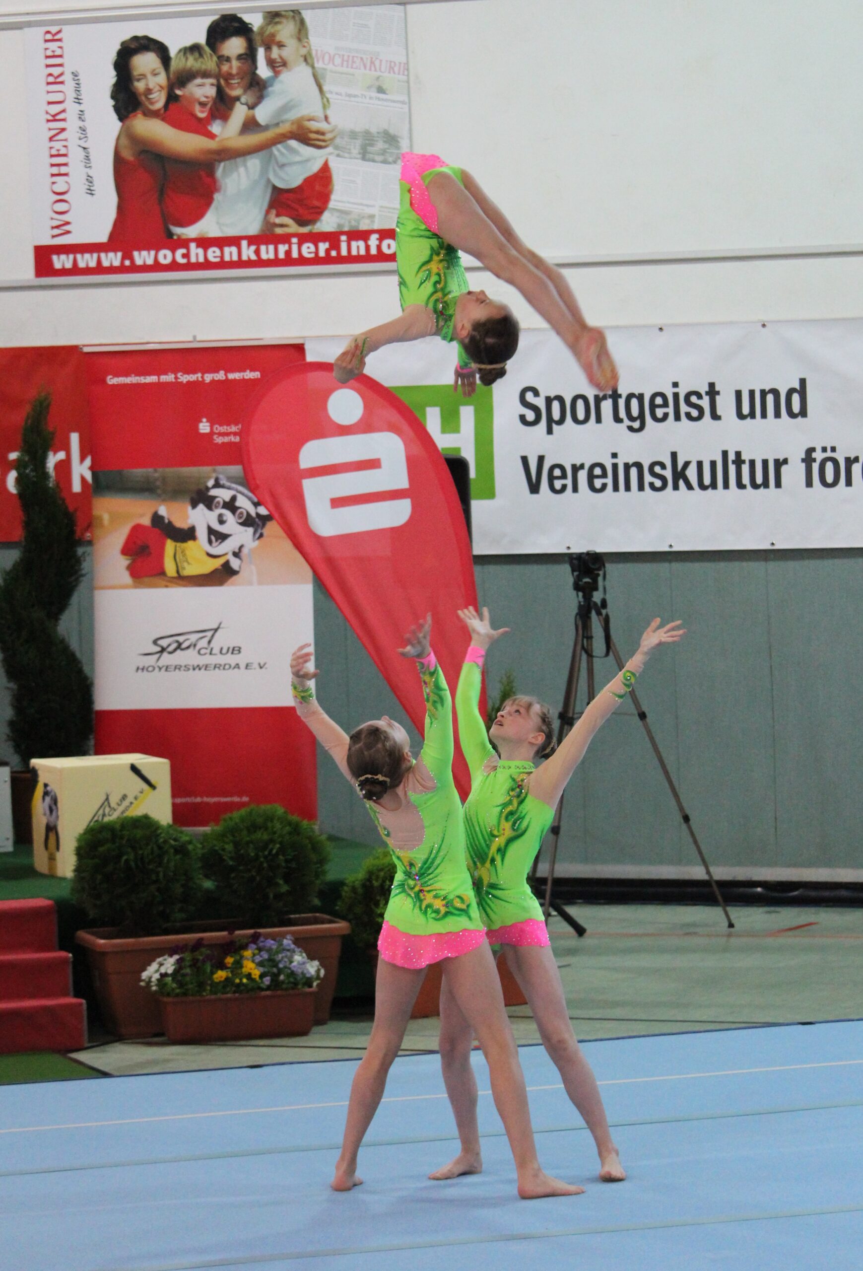 Mit Dresden, Leipzig, Hoyerswerda und Riesa war Sachsen die âHochburgâ in der Sportakrobatik. Diese Sportart hat in dort eine hohe Akzeptanz. Es war beneidenswert: patzte eine Sportlerin war gleich die nĂ€chste Formation zur Stelle. Da kamen sich die Schweriner MĂ€dels, als kleiner Sportakrobatik-Verein in Deutschland, schon etwas verloren vor. So war es auch nicht verwunderlich, dass man auf dem Siegertreppchen vorrangig Sportakrobaten