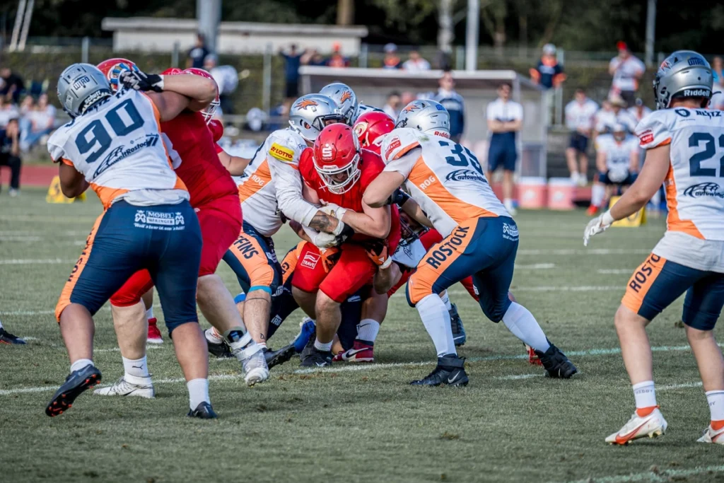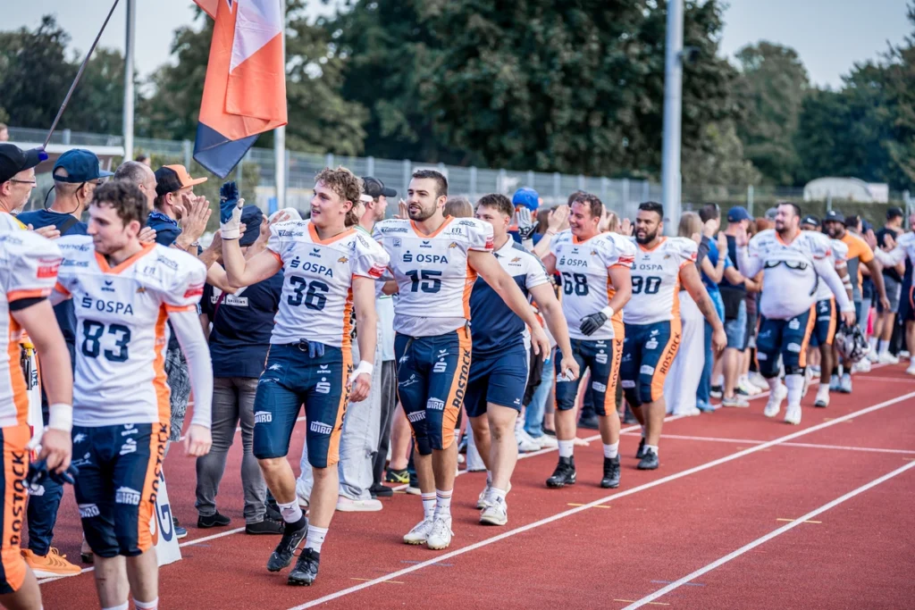 Die Saison 2025 ist vorbei. Nur die gröĂten Optimisten hatten auf einen Ausrutscher Hamburgs gegen Leipzig geglaubt, um so, vorausgesetzt eines Sieges der Rostocker im Ostseederby, noch die erste GFL 2 Meisterschaft nach Rostock zu holen. Diesen Gefallen taten die Pioneers, die erst am letzten Wochenende den Spitzenplatz mit einem Sieg im direkten Duell ĂŒbernahmen, den GrifFANS bei ihrem eigenen sicheren Heimsieg nicht. Die Greifen beenden damit nach dem höchsten Sieg der Vereinsgeschichte die regulĂ€re Serie mit der Vizemeisterschaft bei 8 Siegen und 2 Niederlagen, punktgleich mit dem Meister aus Hamburg. Die LĂŒbecker, die bereits vor der Partie als Absteiger in die Regionalliga feststanden, mussten einem phasenweise geradezu leidtun. Denn bei den Griffins klappte nahezu alles, und vor allem zum Leidwesen der zahlreich mitgereisten Fans, genau alles das, was in der Vorwoche eben nicht klappte.
