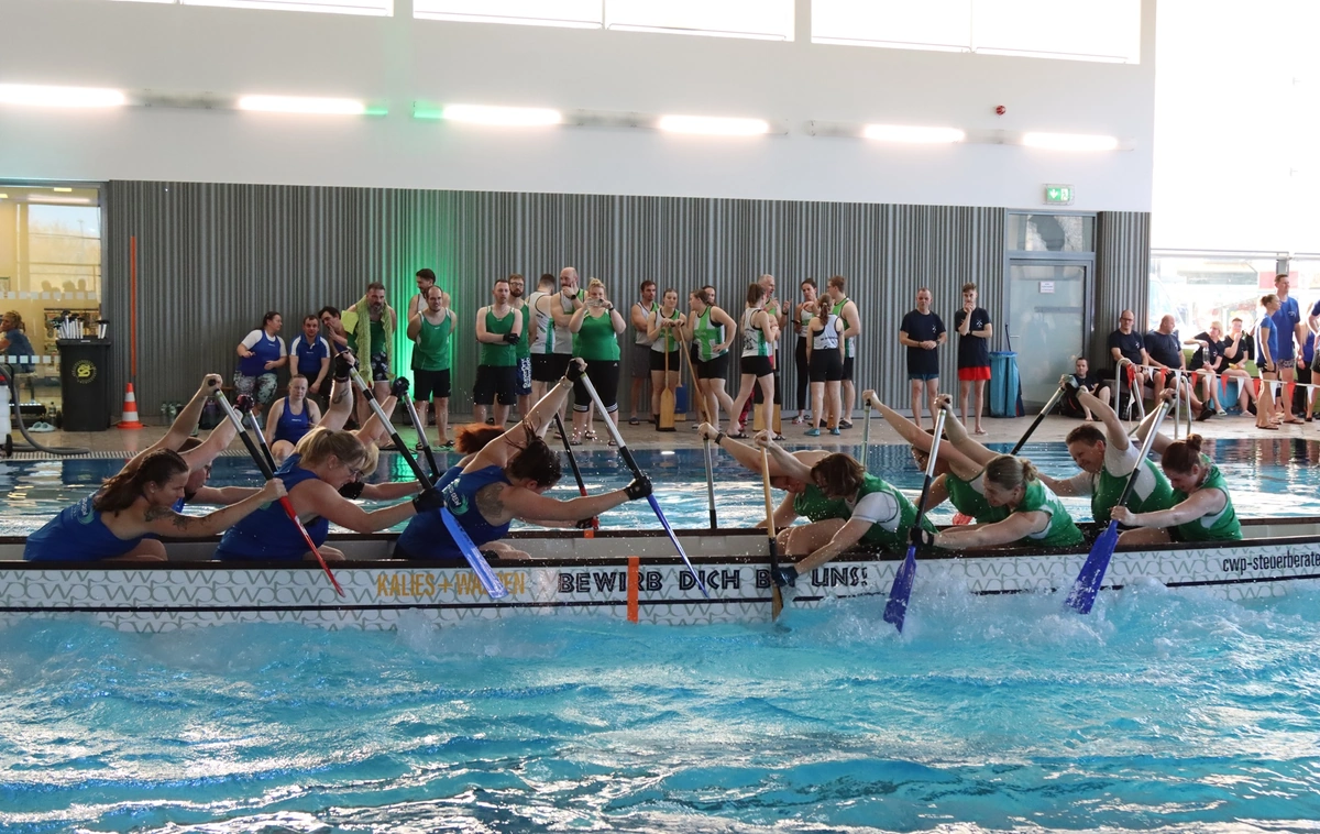 Das Markenzeichen der Hot Water Games bleibt unverĂ€ndert spektakulĂ€r: Drachenboot-Tauziehen im Hallenbecken. Zwei Teams sitzen sich in einem Boot gegenĂŒber, jeweils mit sechs Athletinnen und Athleten besetzt, und versuchen, die Konkurrenz kraftvoll ĂŒber die Ziellinie zu schieben. Was simpel klingt, verlangt in Wahrheit höchste Konzentration, starke Nerven und vor allem perfektes Zusammenspiel. Die dicht gedrĂ€ngte Zuschauerkulisse rund um das Becken sorgt zusĂ€tzlich fĂŒr ein intensives, energiegeladenes WettkampfgefĂŒhl.
