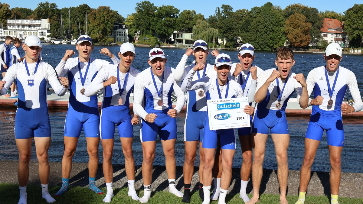Beim Schüler-Achter-Cup der Deutschen Ruderjugend, der im Rahmen von „Jugend trainiert“ ausgetragen wird, geben Birk Lübbert, Max Baumann, Cedric Simonn, Pepe Jonuscheit, Jordan Lenz, Ole Hodea, Hugo Jacob, Leo Jacob und Steuermann Eddi Flack alles und erreichen einen dritten Platz. „Wir haben unsere Platzierung verteidigt. Das war schwierig“, sagt Hugo. Platz 1 geht an die Sportschule Potsdam und Platz 2 an die Humboldtschule Hannover.