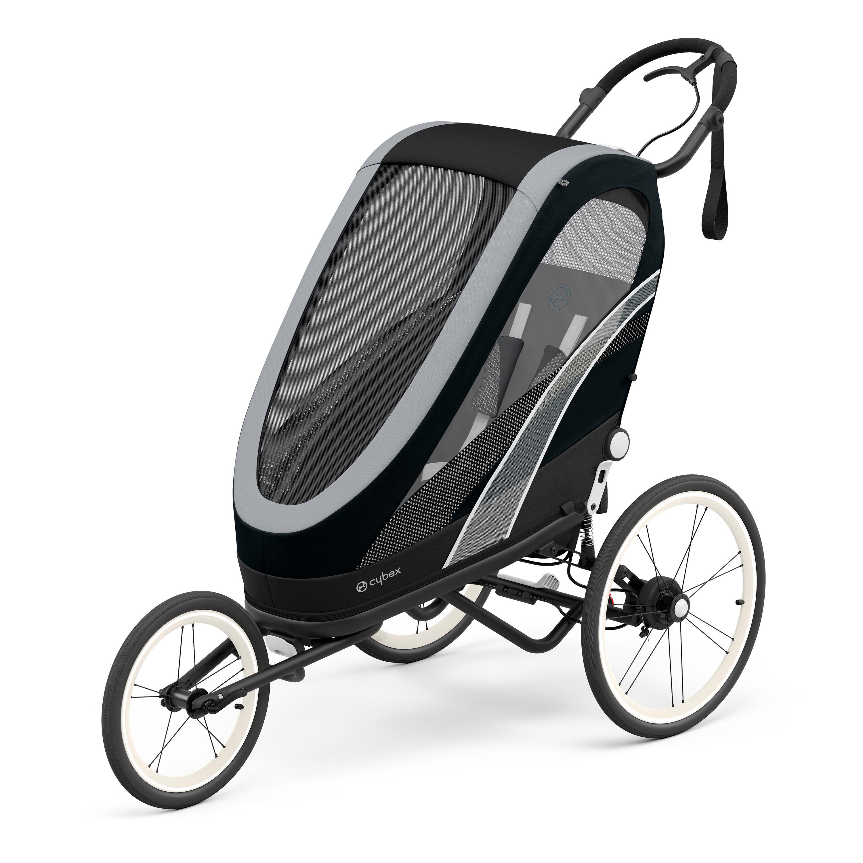 Multisport-Anhänger Zeno geeignet für Joggen, freihändiges Laufen, Fahrradfahren und Skilanglaufen; komplettes Set mit höhenverstellbarer Kabine und Rahmen; komfortables Fahrverhalten mit Hinterradfederung und luftgefüllten Reifen für eine ruhige Fahrt; ultrakomfortabler, gepolsterter Sportsitz mit 5-Punkt-Gurt; ergonomisch verstellbarer Schiebegriff für entspannte Laufeinheiten; der Multisport Adapter Punkt ermöglicht einen schnellen und sicheren Wechsel zwischen den verschiedenen Sportaktivitäten; Handbremse zur Geschwindigkeitsregulierung; rutschfester Silikonschiebegriff; die Netzeinsätze in den seitlichen Panoramafenstern und der Rückenlehne sorgen für eine gute Luftzirkulation im Innenraum der Kabine; das verstellbare Sonnenverdeck aus Stoff mit hohem Lichtschutzfaktor sowie das Wetterverdeck bieten zusätzlichen Wind- und Wetterschutz; reflektierende Details für verbesserte Sichtbarkeit; kompakte Faltung innerhalb Sekunden; maschinenwaschbare Stoffbezüge; kompatibel mit Hands-free Running Kit (496875), Cycling Kit (496901), 2-in-1 Becherhalter (496900) und Fahrradkupplung (496891) (nicht im Lieferumfang enthalten); geeignet für Kinder ab 6 Monate bis 22 kg (ca. 4 Jahre), max. Größe des Kindes: ca. 111 cm; Gewicht: (ohne Frontaufsatz): ca. 12,5 kg; max. Tragfähigkeit: ca. 34 kg; Maße (L/B/H): ca. 1.400-1.500 x 685 x 1.040-1.220 mm (offen), 995 x 580 x 350 mm (gefaltet).