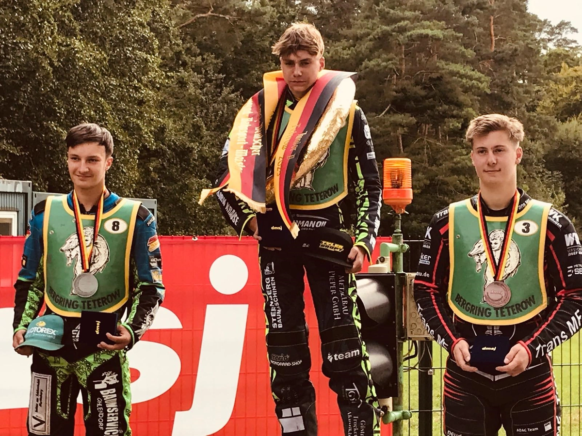 An den beiden Vortagen kam der Junior bereits als NachrĂŒcker bei den MeisterschaftslĂ€ufen der GroĂen in GĂŒstrow und Stralsund zum Einsatz und belegte am Strelasund sogar einen sensationellen fĂŒnften Platz. GlĂŒckstrahlend kommentierte er dann auch auf dem Siegerpodest:â Das lange Wochenende war schon sehr stressig. Den Meistertitel ausgerechnet in meiner Heimatstadt geholt zu haben, macht mich doppelt stolz, zumal ich auf dieser Bahn auch des Ăfteren trainieren darfâ. Der Kampf um die weiteren PlĂ€tze auf dem Podest wurde indes erst im allerletzten Lauf des Renntages entschieden. Levi Böhme vom MC MeiĂen, im Vorjahr Vize-Weltmeister bei der B-Jugend, sicherte sich mit seinem vierten Laufsieg bei einem zweiten Platz den Vizemeistertitel vor Michael Konrad vom AC Landshut und dem GĂŒstrower Magnus Rau.